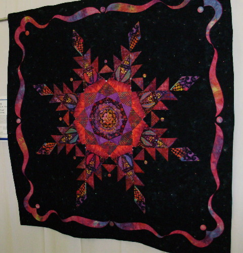 This was one of the guild's challenge quilts. They had to use a particular fabric, and also had to re-work a traditional block pattern. I believe the challenge fabric is the red-orange in the upper right block.